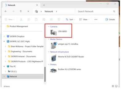 - Once the camera has booted and the camera has a solid red LED, the icon "CRV-800D" will appear in the “Network” section of Windows file explorer.